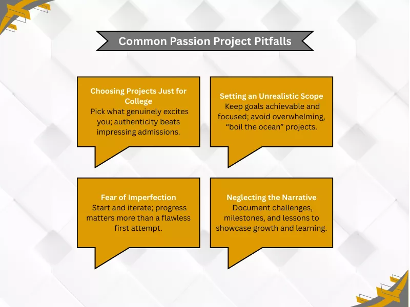 | The "For College" Trap (Inauthenticity) | Choosing a project solely to impress admissions officers, not because it excites you. | Lack of genuine passion will show. Motivation drops, and you can’t speak about it with depth or excitement. | Start with authentic interests, no matter how niche. Passion matters more than topic. |
